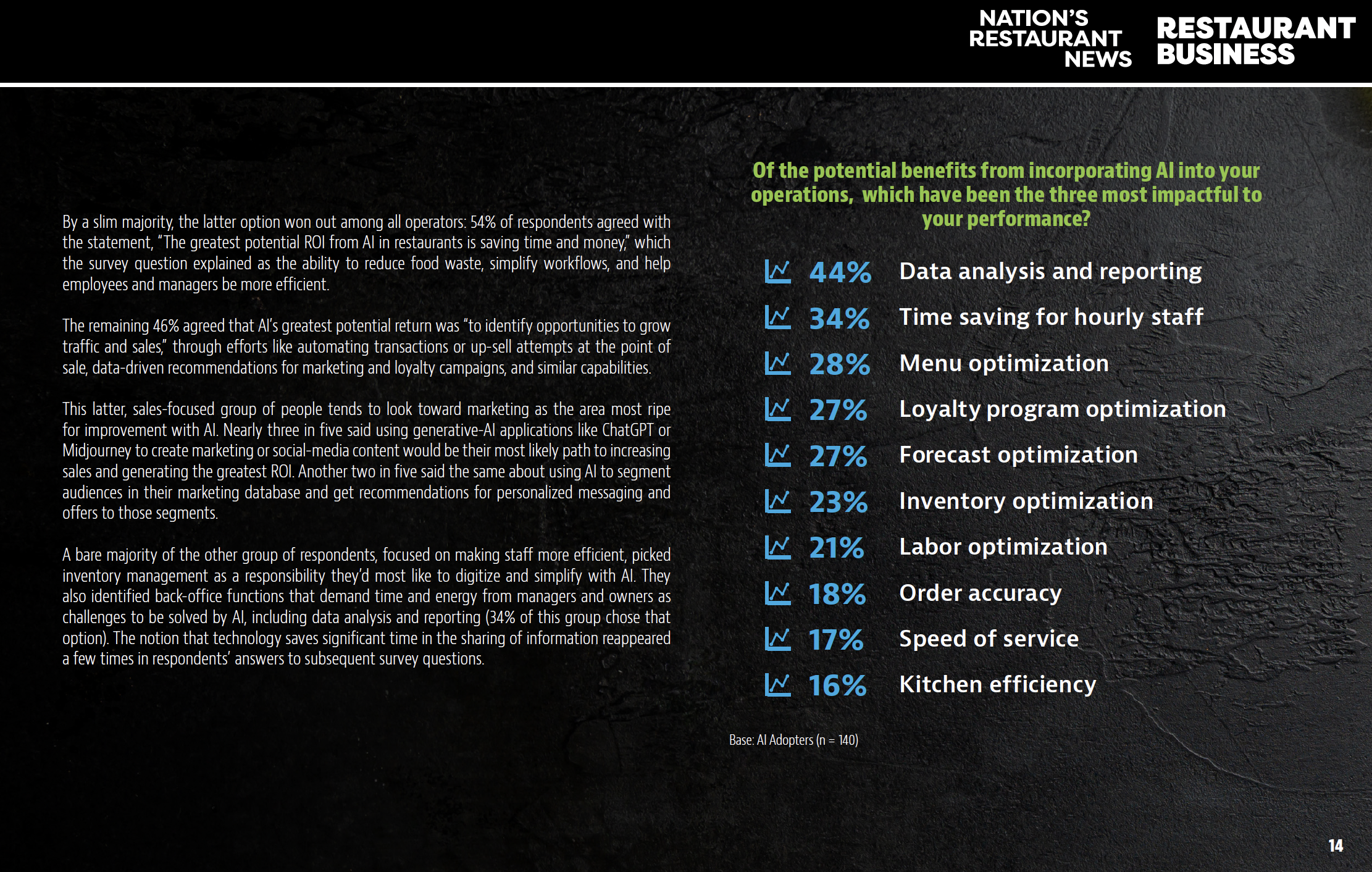 While many restaurant leaders continue to search for use cases that would motivate them to experiment with AI or expand their use of it, those who have already taken the plunge said the technology has made a positive difference across several categories. Early adopters are already reporting better forecasting and data analysis, time savings for managers and other decision makers, and streamlined tasks for hourly workers.